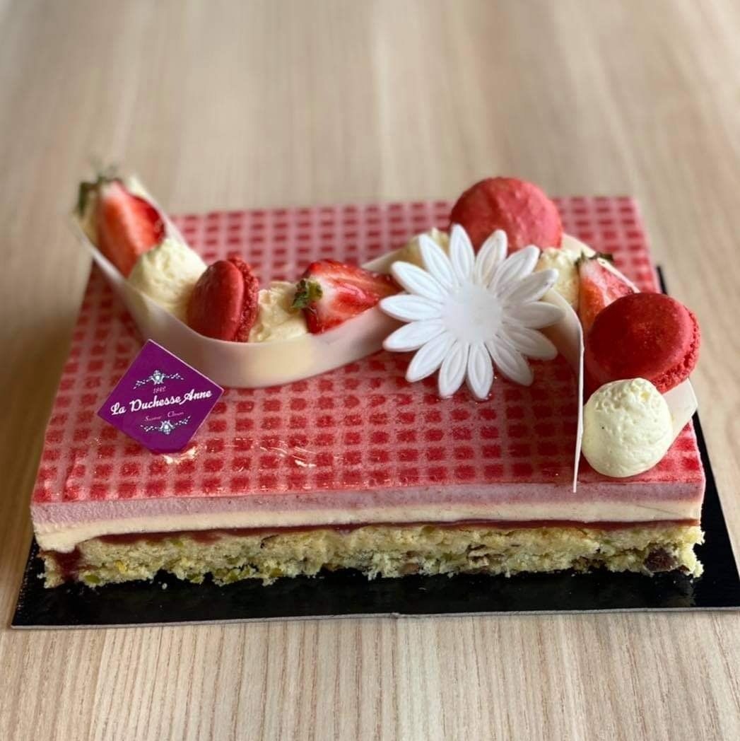 Le Fruit : un biscuit madeleine noisette pistache avec un coulis de fraise, une crème légère citron et une mousse fraise menthe