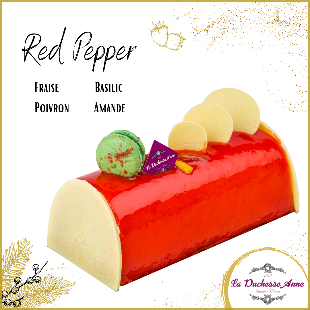 🫑🍓Bûche Red Pepper : l'insolite de ces fêtes de fin d'année ! Explorez le mariage délicat de la fraise et du poivron rouge, relevé par une pointe de basilic, sur un biscuit amandes