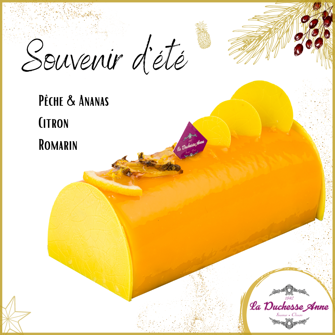 🍍Bûche Souvenir d'Été : en route pour le soleil avec notre bûche Souvenir d'été qui marie avec délicatesse les parfums de l'ananas, de la pêche et du citron avec un petit twist de romarin